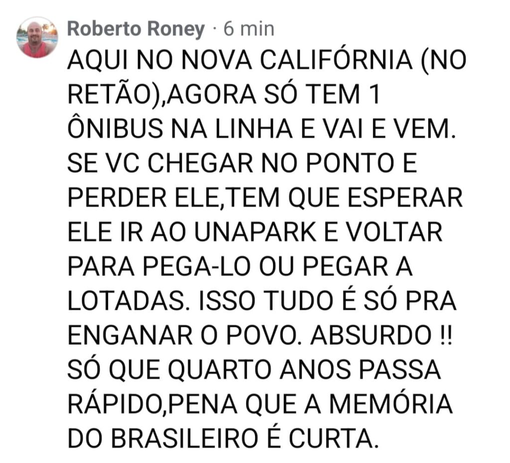 “Aqui no Nova Califórnia (no retão), agora só tem 1 ônibus na linha e vai e vem. Se você perder, tem que esperar ele ir ao Unapark e voltar ou pegar as lotadas. Isso tudo é só pra enganar o povo. Absurdo!”