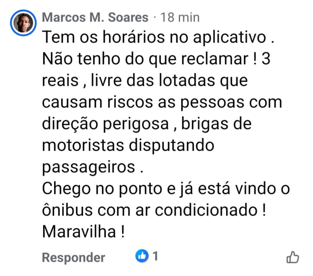“Tem os horários no aplicativo. Não tenho do que reclamar! R$ 3,00, livre das lotadas que causam riscos com direção perigosa, brigas de motoristas disputando passageiros. Chego no ponto e já está vindo o ônibus com ar-condicionado! Maravilha!”